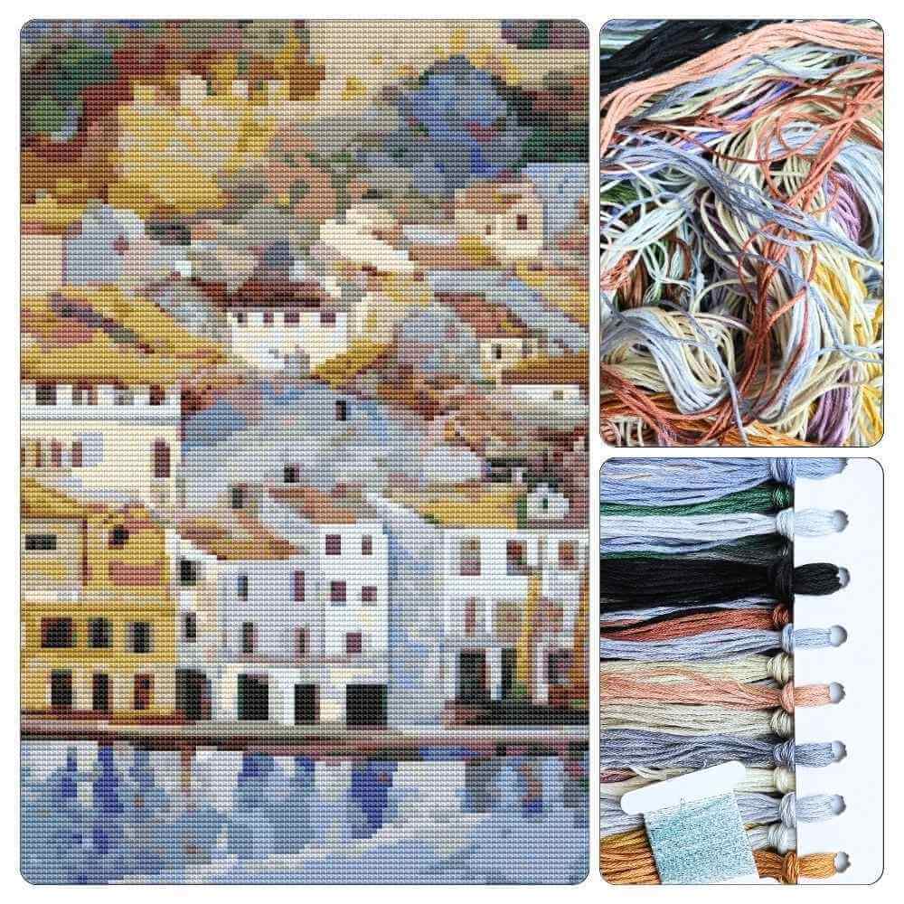 At the Garden Cross Stitch Kit by Gustav Klimt captures the charm of an old-world European town, where colorful houses cluster along the water’s edge. The golden and earthy tones evoke a sense of warmth, while the calm reflection in the river adds a peaceful, dreamlike quality.