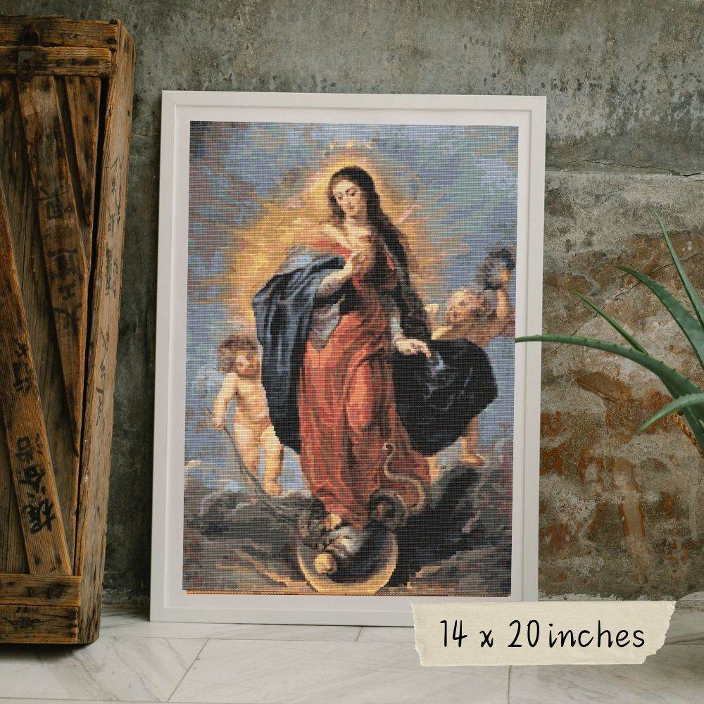 Celebrate classic art with the Immaculate Conception Cross Stitch Kit, inspired by Peter Paul Rubens. This kit features a radiant depiction of the Virgin Mary surrounded by cherubs, capturing the beauty and reverence of this timeless masterpiece.
